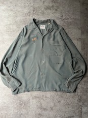 レーヨン特有のドレープ感と光沢感があり、当時ならではの上質な素材感が魅力。フロントにはユニークなアニマルモチーフの刺繍が施されています。