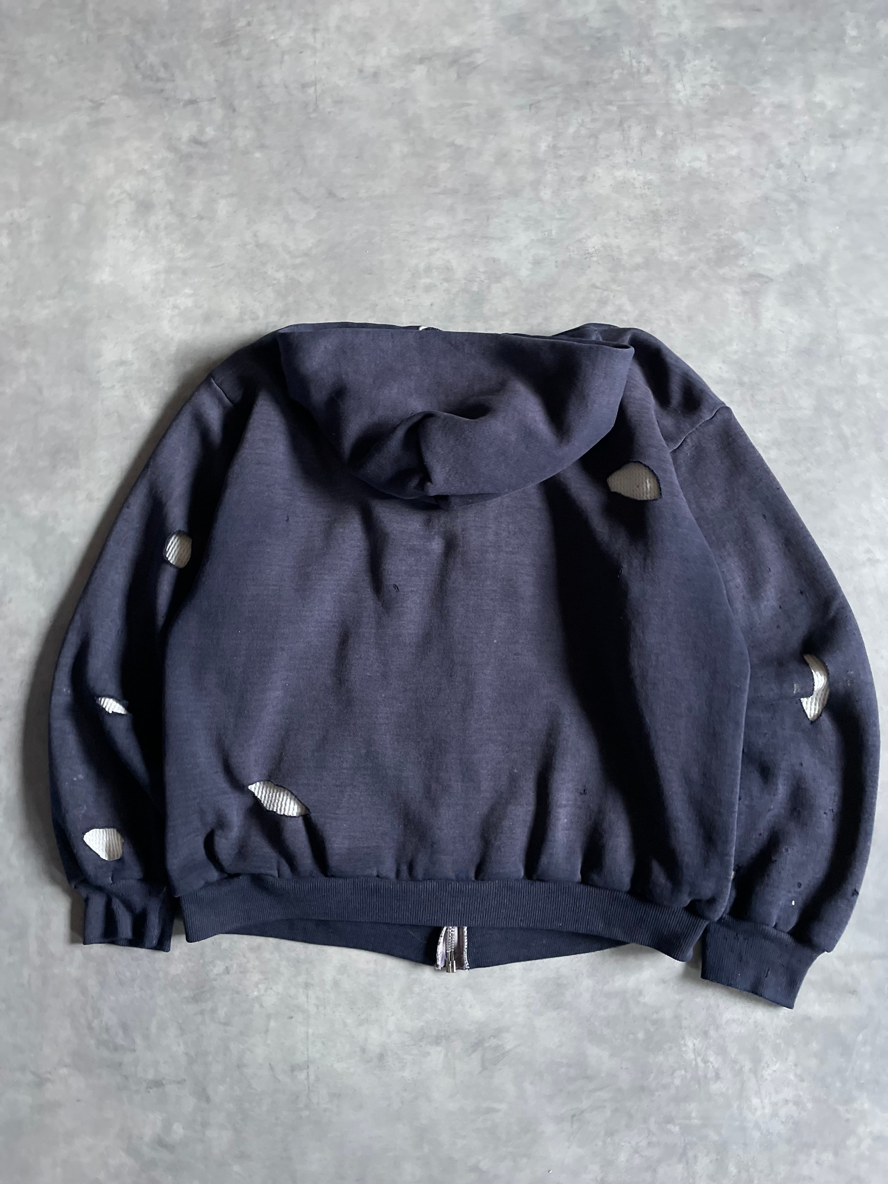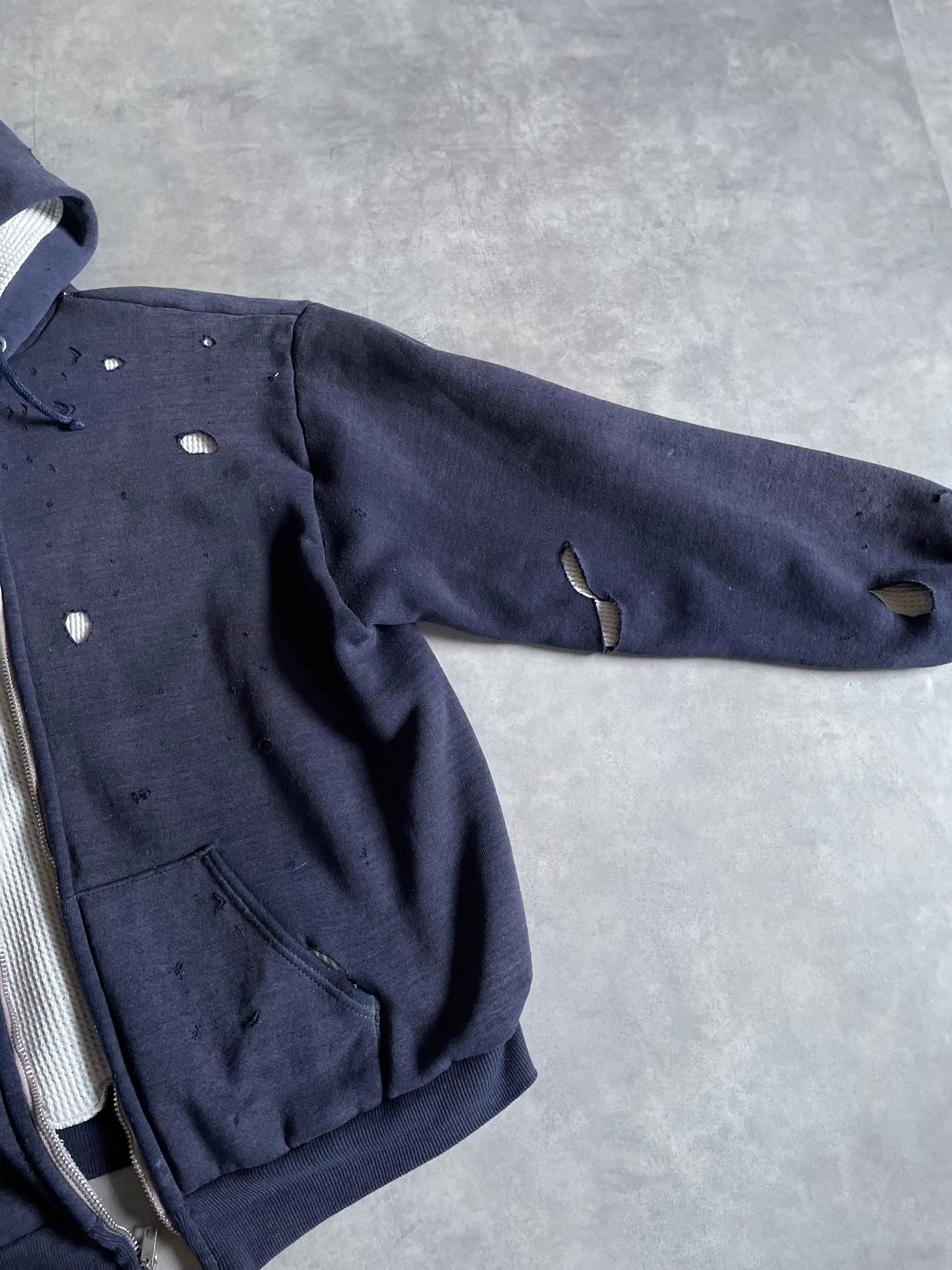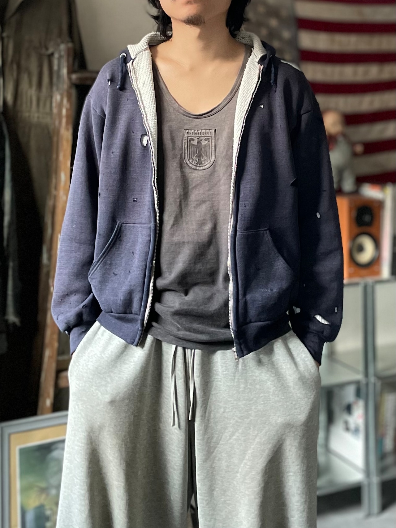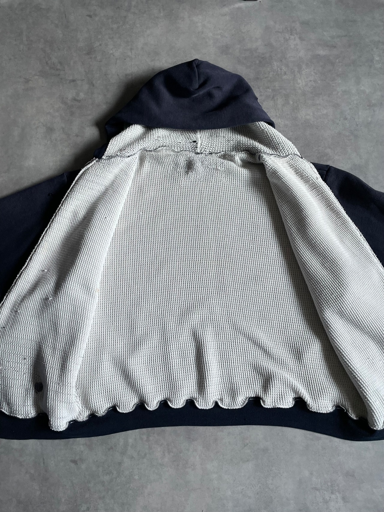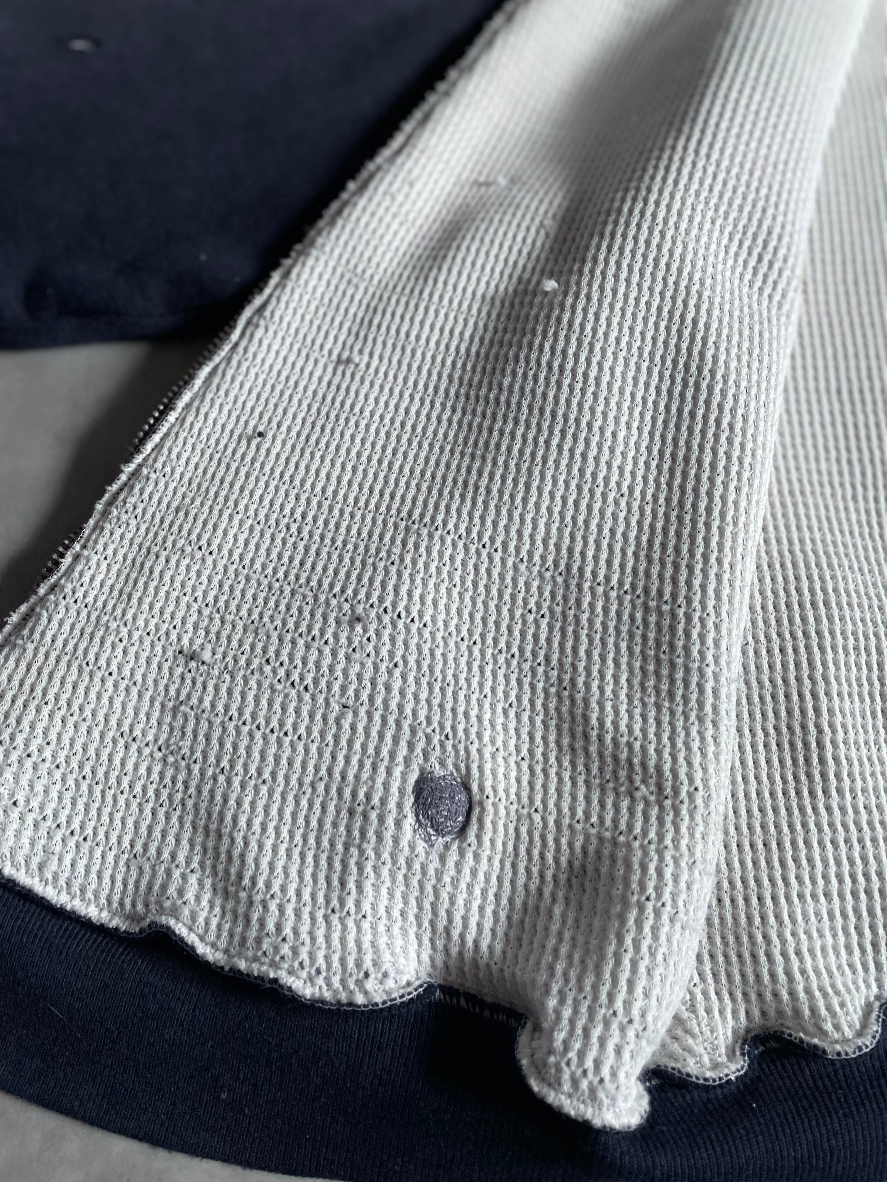 表地にスウェット、裏地にワッフルサーマルを配した、当時らしい防寒性の高い二重構造が特徴の一着です。