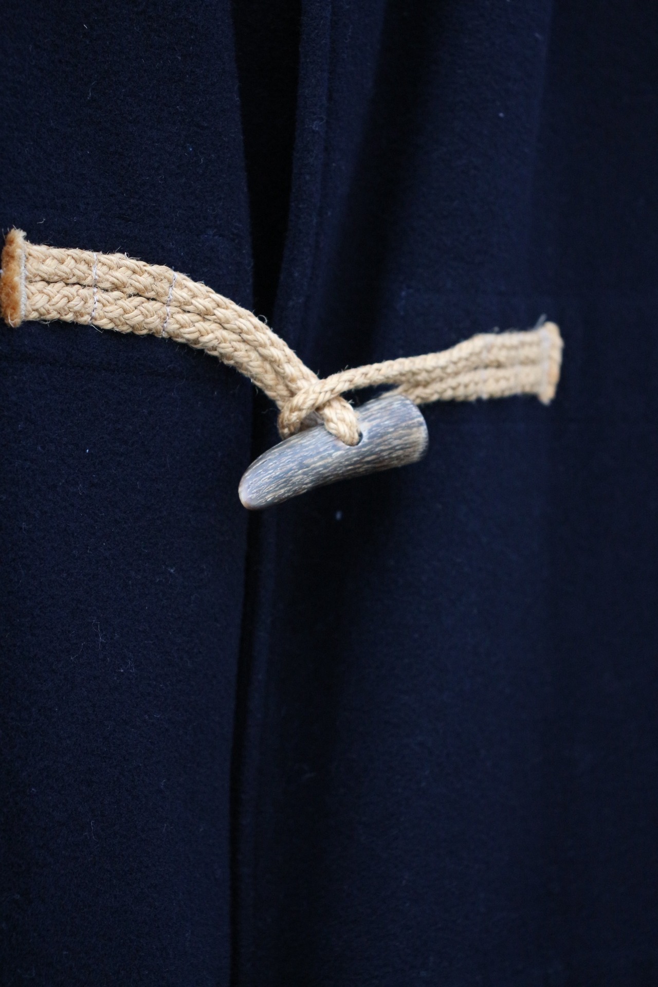 トグルには木製パーツ、留め具には太めのコットンロープを採用されております。